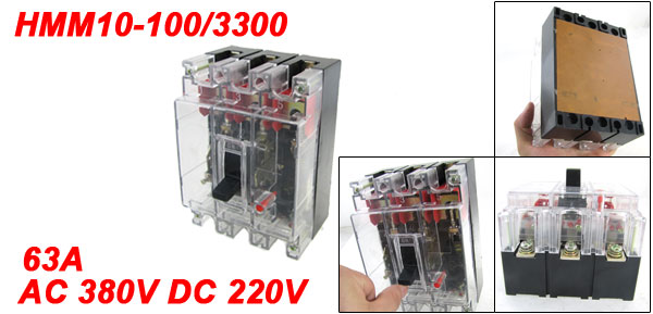 Product Name Moulded Case Circuit Breaker Model No. HMM10-100/3300 Feature Transparent Poles 3P Rated Insulation Voltage AC 380V Rated Frequency 50Hz Rated Voltage AC 380V, DC 220V Rated Current 63A Breaking Capacity of Short Circuit(AC) 12kA Overall Size(Approx.) 153 x 108 x 97mm / 6.0" x 4.25" x 3.8"(L*W*H) Casing Material Plastic Net Weight 1001g Package Content 1 x Moulded Case Circuit Breaker - Reviews