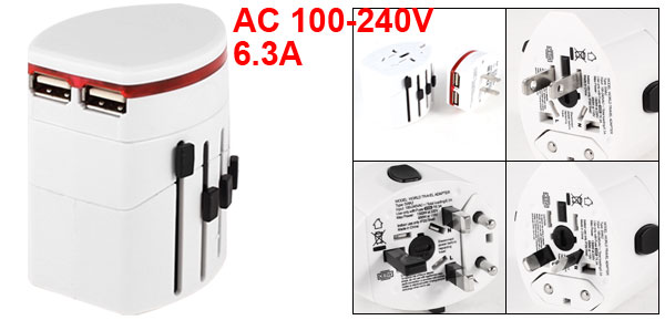 Product Name World Travel Socket Adapter Material(External) Plastic, Metal Design Europe Standard, UK Standard, USA Standard, Australia Standard,USB 2.0 Color White Input 100-240VAC Total Loading 6.3A Max Power 130W at 220V