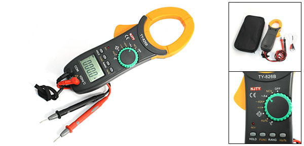 Product Name Digital Clamp Multimeter Model TY-826B AC Current 40A/400A/1000A, ±(2%+5) AC Voltage 400mV/4V/40V/400V/1000V, ±(1.2%+5)DC Voltage 400mV/4V/40V/400V/750V, ±(0.8%+5)Resistance 400/4K/40K/400K/4M/40M, ±(1.2%+5)Temperature -20°C-+750°C, ±(3%+5) Duty Cycle (forReference) 10Hz/100Hz/1000Hz/10KHz/100KHz/10MHz 1%-99%, ±(0.5%+5)Capacitance 5nF/50nF/500nF/5uF/50uF, ±(3%+5)>10uF, ±(5%+5)>100uF, ±(8%+5)Power Supply 2 x 1.5V AA Batteries(Not Included Here) Clamp Meter Size 24.5 x 8.5 x 3.5cm/ 9.6" x 3.3" x 1.4"(L*W*T) Mateiral Plastic, Electronic Parts Main Color Iron-gray, Orange Total Weight 537g Package Content 1 x Digital Clamp Multimeter