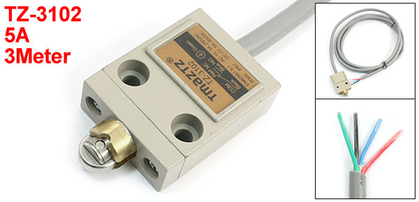 Product Name Limit Switch Model No. TZ-3102 Contact Configuration 1NO+1NC(SPDT) Actuator Type Roller Plunger Action Type Momentary Ith 5A AC-15 250VAC 5A DC-12 30VDC 5A Waterproof Level IP67 Roller Size 12 x 3.7mm/0.47" x 0.15"(D*T) Actuator Size 12.5 x 8mm/ 0.49" x 0.315"(D*L) Installing Hole Size 5.5mm/0.22"(Dia) Installing Hole Distance 2.5cm/1"(L*W)(Center to Center) Total Length 3Meter/9.8Ft Switch Size 6.5 x 3.8 x 1.6cm/2.6" x 1.5" x 0.63"(L*W*H) Material Plastic, Metal Main Color Gray Net Weight 340g Package Content 1 x Limit Switch - Reviews
