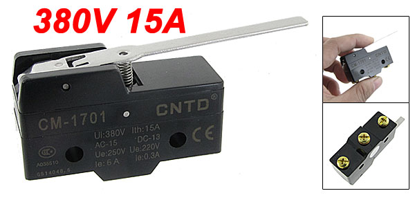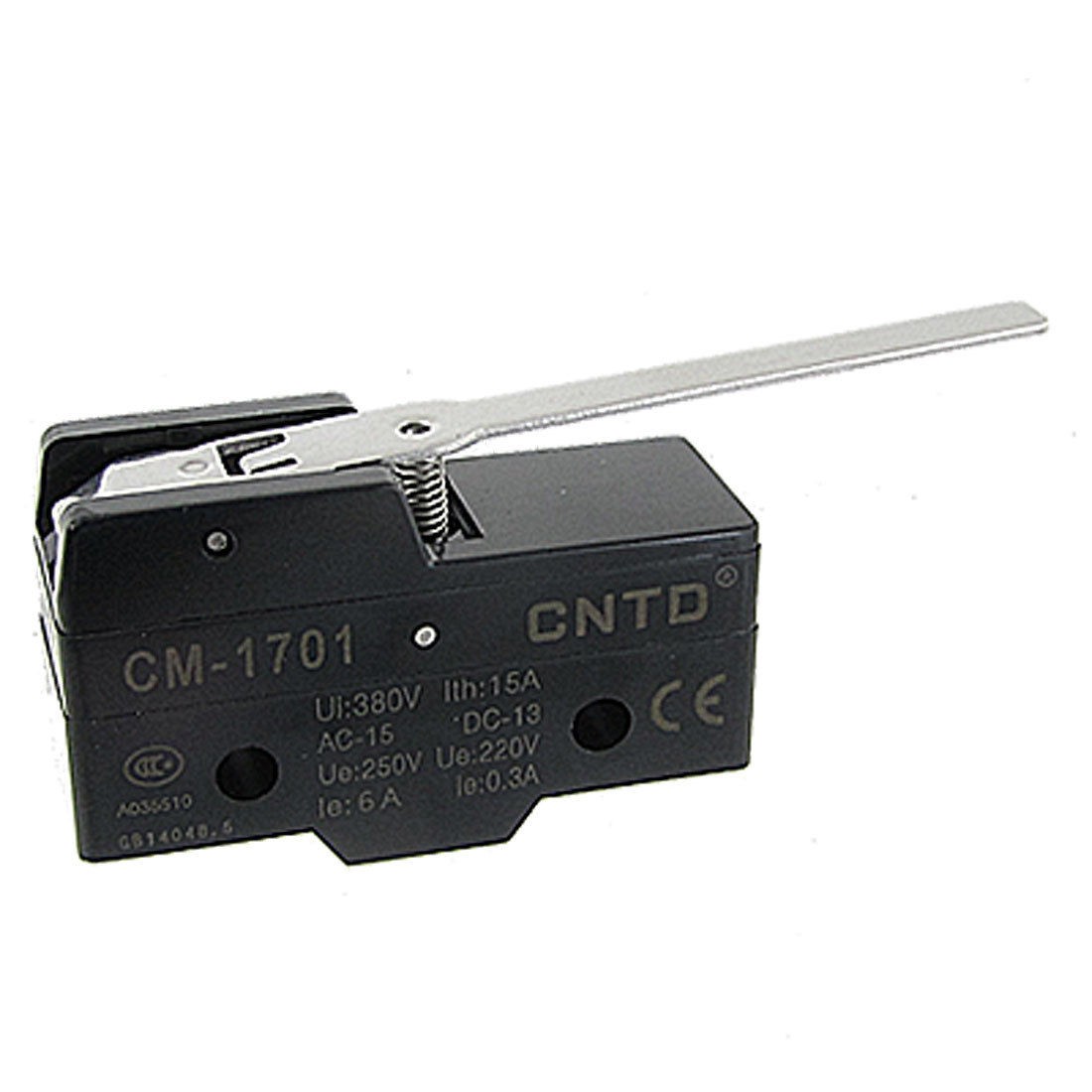 Product Name Micro Switch Model No. CM-1701 Actuator Type Straight Long Hinge Lever Contact Type 1 NO, 1 NC, 1 Com Terminal Type Screw Terminals Ui 380V Ith 15A AC-15 Ue: 250V, le: 6A DC-13 Ue: 220V, le: 0.3A Actuator Size 7.3 x 0.8cm / 2.87" x 0.3"(L*Max W) Hole Dia 0.42cm / 0.165" Overall Size 5 x 1.75 x 2.94cm / 2" x 0.69" x 1.1"(L*W*H) Material Metal, Plastic Color As Picture Show Net Weight 37g Package Content 1 x Micro Switch - Reviews