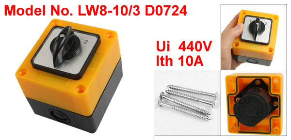 Product Name Universal Switch Model No. LW8-10/3 D0724 Ui 440V Ith 10A Overall Size 76 x 70 x 90mm / 2.99" x 2.75" x 3.54"(L*W*Max.H) Mounting Hole Distance 54 x 49mm/ 2.12" x 1.92"(L*W) External Material Plastic Color Yellow, Black Net Weight 194g Package Content 1 x Universal Switch 4 x Installing Screw - Reviews