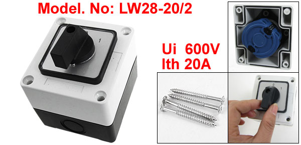Product Name Cam Switch Model. No LW28-20/2 Control Type On - Off Positions Quantity 2 Terminals Quantity 8 Ui 600V Ith 20A Ue 380V, 220V Ie AC-15: 095A, 1.6A DC-13: 0.14A AC-3: 5A Handle Size 3.5 x 0.9cm / 1.37" x 0.35"(L*W) Overall Size 7.6 x 7 x 9cm / 3" x 2.7" x 3.5"(L*W*H) Mateiral Plastic & Electronics Color Black & White Net Weight 180g Package 1 x Cam Switch - Reviews