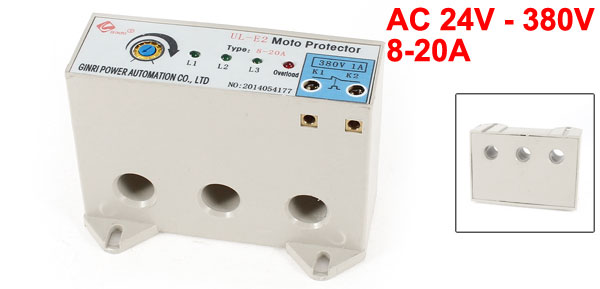 Product Name Motor Protector Type UL-E2 Reset Time 60 ± 10s Work Mode Uninterrupted Work Mode Applicable Voltage AC 24V - 380V / 45 ~ 60 Hz Current Adjustment Scope 8-20A Applicable Motor Power 1.5 - 2.5KW Wire Hole Dia. 11mm/0.43" Control Current of Output Interface 1A/380Vac Environment Temperature -10C - +50C Relative Humidity <=90% Atmospheric Pressure 80Kpa~110Kpa Altitude no more than 200m Total Size 9.2 x 6.3 x 4.2cm/3.6" x 2.5" x 1.7"(L*W*H) Weight 166g Package Content 1 x Motor Protector