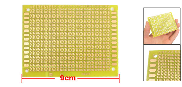 Product Name Universal PCB Board Hole Dia(Approx) 1mm / 0.039" Hole Pitch(Approx) 2.54mm / 0.1" Size(Approx) 7 x 9cm / 2.75" x 3.5"(L*W) Thickness(Approx) 0.115cm / 0.04“ Material FR-4 Color Yellow Weight 12g Package Content 1 x Universal PCB Board - Reviews