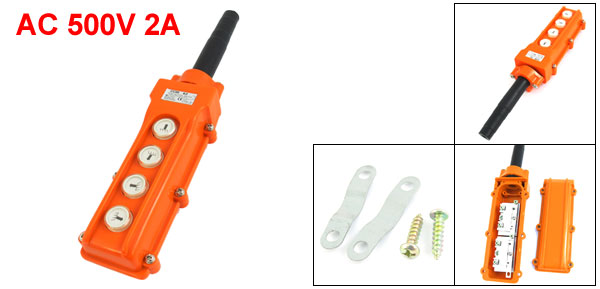 Electromagnetic Voltage & Current AC 250V 5A Rated Voltage & Current AC 500V 2A Type 4Way,4 Button Body Size(Approx.) 19 x 6.9 x 4.9cm /7.5" x 2.7" x 2"(L*W*T) Jointing Sleeve Size 13 x 2.1cm /5.1" x 0.83"(L*Dia.) Housing Material Plastic, Metal Color Orange Net Weight 264g Package Content 1 x Hoist Control Push Button Switch