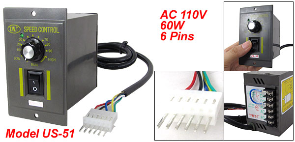 Product Name Motor Speed Controller Model US-51 Material Plastic, Electrical Material Connector Type 6 Pins Rated Value AC 110V, 50HZ Power 60W Size 8.8 x 6 x 10cm/ 3.5" x 2.4" x 3.9" (L*W*H) Cable Length 60cm/23.6'' Color Gray Weight 235g Package Content 1 x Motor Speed Controller - Reviews