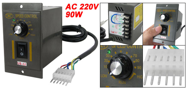 Product Name Motor Speed Controller Model US-52 Material Plastic, Electrical Material Connector Type 6 Pins Rated Value AC 220V, 50HZ Power 90W Size 8.8 x 6 x 10cm/ 3.5" x 2.4" x 3.9" (L*W*H) Cable Length 60cm/23.6'' Color Gray Weight 238g Package Content 1 x Motor Speed Controller - Reviews