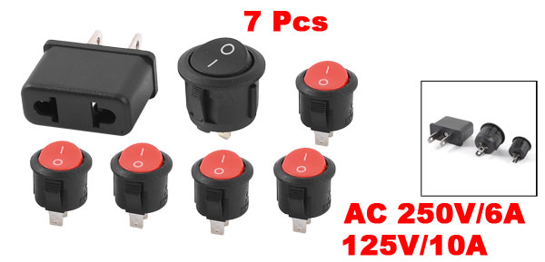 US Plug 7 in 1 Black Red SPST Round Rocker Switch 250V/6A 125V/10A w AC Adapter