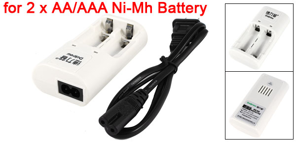 Product Name Battery Charger Applicable for AA/AAA Ni-Mh Rechargeable Battery Design 2 Charging Positions Plug Type US Plug Indicator Light Red(Charging),Green(Power) Input AC 100-240V, 50-60Hz. Output DC1.4V 300±50mA Cable Length 1M/3.3Ft Size 10 x 5 x 3cm/ 3.9" x 2" x 1.2"(L*W*T) Color White Shell Material Hard Plastic Net Weight 130g Package Content 1 x Battery Charger - Reviews