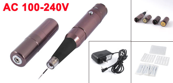 DetailsUS Plug AC 100-240V Eyebrow Tattoo Pen Machine Needle Tip Power Battery Set  Main Color Light Purple, Black Net Weight 126g Brand DMiotech Country of Manufacture CHINA Power Supply AC 100-240V 50/60Hz Package Content 1 x Eyebrow Tattoo Pen Mahine Cable Length 1.7M/5.5Ft Eyebrow Tattoo Pen 13 x 2cm/5.1" x 0.8(L*D) Rotating Speed 15000-35000R/min Plug Type US Plug Material Aluminum, Rubber, Plastic, Electric Parts