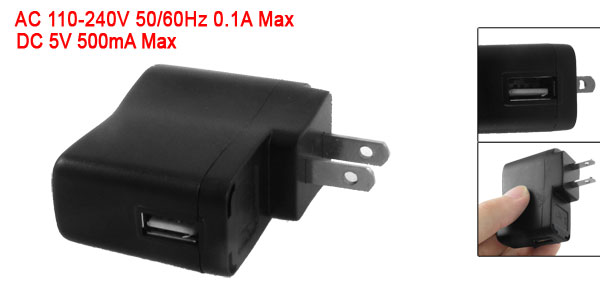 Product Name USB Power Adapter AC Wall Charger Input AC 110-240V 50/60Hz 0.1A Max Output DC 5V 500mA Max Plug Type US Plug External Material Plastic Color Black Overall Size 22 x 63 x 58mm / 0.8" x 2.5" x 2.3" (L*W*H) Weight 31g Package Content 1 x USB Power Adapter AC Wall Charger - Reviews