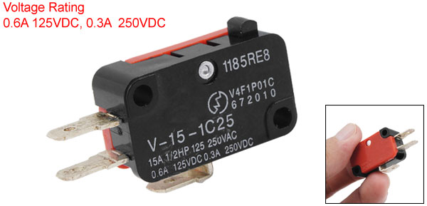 Product Name Micro Switch Model V-15-1C25 Material(External) Plastic, Metal Color Black, Red Overall Dimension 3.8 x 2.1 x 1cm(L*W*H) Pin Length 1.2cm/0.47" Voltage Rating 0.6A 125VDC, 0.3A 250VDC Current Rating 15A 1/2HP 125 250VAC Use V4F1P01C Weight 6g Package Content 1 x Micro Switch - Reviews