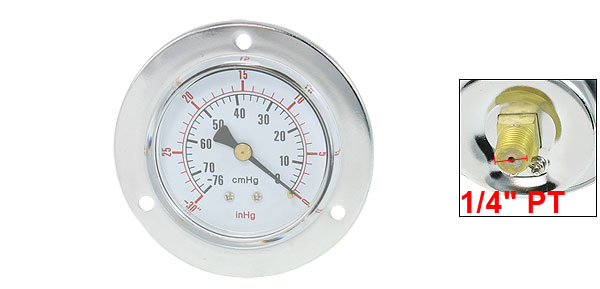Product Name Vacuum Gauge Range -76~0 inHg Total Size 83 x 46mm/ 3.3" x 1.8" (D*T) Thread Diameter 13mm Thread Size 1/4" PT External Material Metal, Plastic Color Silver Tone Net Weight 133g Package Content 1 x Vacuum Gauge - Reviews