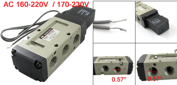 Product Name Solenoid Valve Model VF5120 Type 5 Way 2 Position Voltage AC 160-220V; AC 170-230V Operating Pressure 1.5-9kgf/cm2 Thread Diameter(Each) 14.6mm / 0.57" Total Size (Approx.) 14.8 x 4.5 x 3.2cm / 5.8" x 1.8" x 1.2"(L*W*T) Cable length 32cm / 12.6" Material Metal, Plastic Color As Picture Shown Net Weight 364g Package Content 1 x Solenoid Valve - Reviews