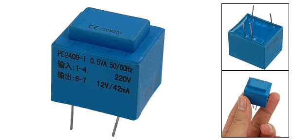 Product Name Encapsulated Transformer Model No. PE2409-I Primary Work Voltage AC 220V Work Frequency 50-60Hz Insulation Grade Grade B Power 0.5VA Primary Pin 1-4 Secondary Pin 6-7 Secondary Full-load Voltage 12V Secondary No-load Voltage 21.6V Secondary Output Current 42mA Mounting Height 22.8mm/ 0.9" Number of Pins 4 Pin Length 9mm/ 0.93" Pin Diameter 0.8mm/ 0.031" Overall Size(Approx.) 26 x 22 x 32mm/ 1" x 0.87" x 1.26" (L*W*H) Material Epoxy Resin Color Blue Weight 41g Package Content 1 x Encapsulated Transformer - Reviews