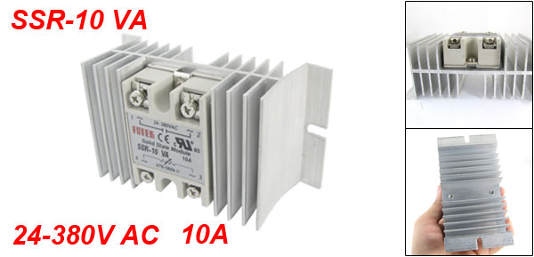 DetailsVoltage Resistance Regulator Solid State Relay SSR 10A 24-380V AC + heat sink  Product Name Solid State Relay Model No. SSR-10 VA Load Current 10A Load Voltage 24-380V AC Potentiometer Input Resistance & Power 470-560KΩ(Potentiometer is not included) Mounting Hole Diameter 5mm / 0.2" Total Size (Approx.) 126 x 70 x 52mm / 5.0" x 2.8" x 2.0" (L*W*H) Heatsink Material Aluminum Color Silver Tone Weight 277g Package Content 1 x Solid State Relay