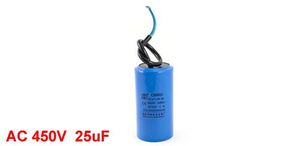 Product Name Motor Capacitor Housing Material Plastic Dielectric Material Polypropylene Film Model CBB60 Capacitance 25uF Tolerance ±5% Rated Voltage 450V AC Frequency 50/60Hz Body Size 9.5 x 5cm / 3.7 x 2" (H*D) Wire Length 21cm /8.3" Color Blue Weight 142g Package Content 1 x Motor Capacitor - Reviews