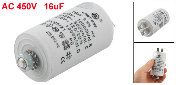 Product Name Motor Capacitor Dielectric Material Polypropylene Film Housing Material Plastic Capacitance 16uF Tolerance +/-5% Rated Voltage AC 450V Size 4 x 7cm/ 1.6" x 2.8" (Dia.*H) Thread Diameter 8mm/ 0.3" Color White Weight 104g Package Content 1 x Motor Capacitor - Reviews