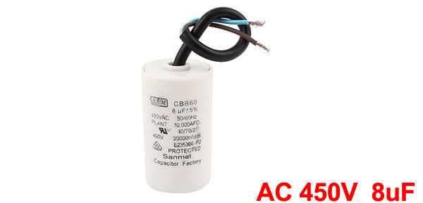 Product Name Motor Run Capacitor Model CBB60 Rated Capacitance 8uF Tolerance ±5% Rated Voltage AC 450V Frequency 50/60Hz Body Size 62 x 34mm / 2.4" x 1.3"(H*D) Wire Length 17cm / 6.7" Main Material Polypropylene Film, Plastic Main Color White Weight 54g Package Content 1 x Motor Run Capacitor - Reviews