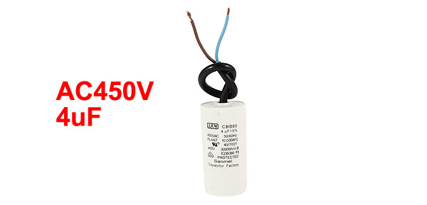 Terminal Wire Ambient Temperature 40/70/21 Rated Capacitance 4uF Tolerance ±5% Rated Frequency 50/60Hz Rated Voltage 450V AC Size 3 x 7cm/ 1.2" x 2.76"(D*H) Wire Length 18cm/ 7.1" Main Color Beige Net Weight 57g Package Content 1 x Motor Capacitor - Reviews
