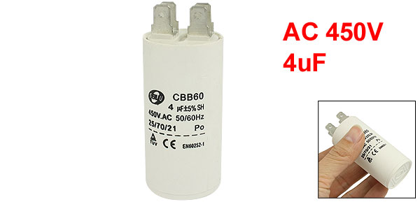 Product Name Motor Capacitor Material Polypropylene Film Model CBB60 Capacitance 4uF Tolerance ±5% Rated Voltage AC 450V Frequency 50/60Hz Body Size 27 x 61mm/ 1.1" x 2.4" (D*H) Color White Weight 51g Package Content 1 x Motor Capacitor - Reviews