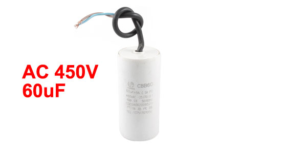 Product Name Motor Capacitor Material Polypropylene Film Model CBB60 Capacitance 60uF Tolerance ±5% Rated Voltage AC 450V Frequency 50/60Hz Body Size 47 x 103mm/ 1.9" x 4.1" (D*H) Wire Length 20cm/ 7.8" Main Color White Weight 203g Package Content 1 x Motor Capacitor - Reviews