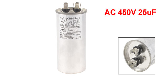 Product Name Motor Capacitor Material Polypropylene Model CBB65A-1 Capacitance 25uF Rated Voltage AC 450V Tolerance +/-5% Frequency 50/60Hz Operating Temperature 40/70/21 Body Dimension 10.2 x 4.8cm/ 4.0" x 1.9"(H*D) Total Length 11.2cm/ 4.4" Color Silver Tone Weight 193g Package Content 1 x Motor Capacitor - Reviews