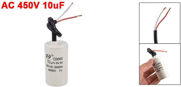DetailsWashing Machine Non Polar AC 450V Motor Run Capacitor 10uF  Product Name Motor Capacitor Housing Material Plastic Dielectric Material Metallized Polypropylene Film Model CBB60 Capacitance 10uF Tolerance 5% Rated Voltage 450VAC Frequency 50/60Hz Body Size 3.3 x 6.3cm/ 1.3" x 2.4"(D * H) Wire Length 19cm / 7.5" Color White, Black Weight 65g Package Content 1 x Motor Capacitor