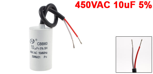 Product Name Motor Capacitor Housing Material Plastic Dielectric Material Polypropylene Model CBB60 Capacitance 10uF Tolerance ±5% Rated Voltage 450VAC Frequency 50/60Hz Body Size 3.4 x 6.2cm/ 1.3" x 2.5" (D*H) Cable Length 21cm/ 8.3" Color White Weight 75g Package Content 1 x Motor Capacitor - Reviews