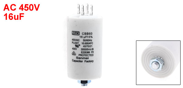 Product Name Motor Capacitor Material Polypropylene Film Model CBB60 Capacitance 16uF Tolerance ±5% Rated Voltage AC 450V Frequency 50/60Hz Body Size 40 x 70mm/ 1.6" x 4.5" (D*H) Main Color White Weight 72g Package Content 1 x Motor Capacitor - Reviews