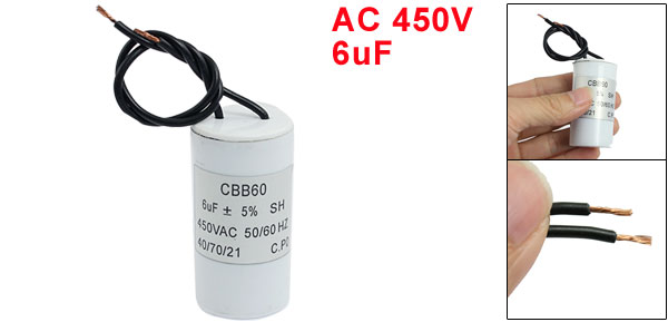 Product Name Motor Capacitor Housing Material Plastic Dielectric Material Polypropylene Model CBB60 Capacitance 6uF Tolerance ±5% Rated Voltage 450VAC Operating Temperature 40/70/21 Frequency 50/60Hz Body Size 2.6 x 5.2cm / 1" x 2" (D * H) Wire Size(Approx.) 10 x 0.2cm / 3.9" x 0.08" (L * Max.D) Color White Weight 36g Package Content 1 x Motor Capacitor - Reviews
