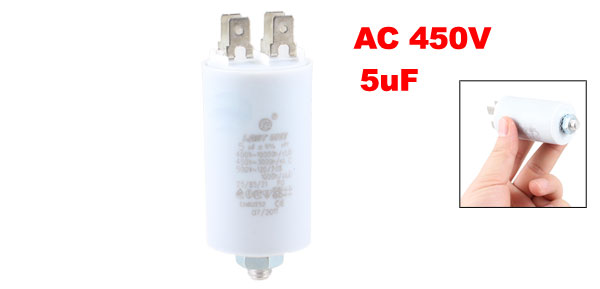 Product Name Motor Capacitor Material(External) Plastic Rated Capacitance 5uF Tolerance +/-5% Rated Voltage AC 450V Size 5.5 x 3cm / 2.2" x 1.2" (L*D) Thread Dia 7.7mm / 0.3" Main Color White Weight 60g Package Content 1 x Motor Capacitor - Reviews