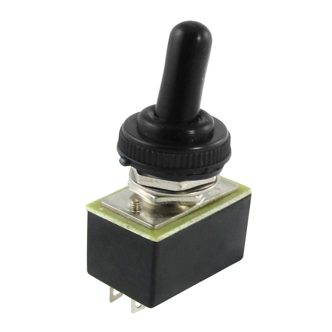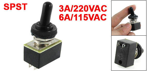 DetailsWaterproof Boot Handle 2 Pin 1P1T SPST ON/OFF Toggle Switch  Product Name Toggle Switch Type SPST (ON/OFF) Position 2 Mounting Hole Diamter 11.7mm / 0.46" Voltage & Current 3A/220VAC 6A/115VAC Main Body Size 28 x 17.5 x 15.6mm / 1.1" x 0.69" x 0.6"(L*W*H) Overall Height 52.5mm / 2.1" Material Metal, Resin & Rubber Color As Picture Shown Weight 21g Package Content 1 x Toggle Switch