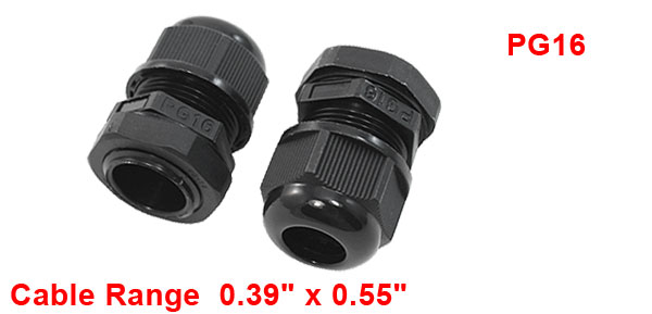 Product Name Cable Gland Model PG16 Cable Range 10-14mm / 0.39" x 0.55" Thread O.D. 25mm / 1" Thread Length 10mm / 0.39" Total Size 3.2 x 4.5cm / 1.26" x 1.8" (Max.D*H) Material Plastic Color Black Weight 37g Package Content 2 x Cable Glands - Reviews