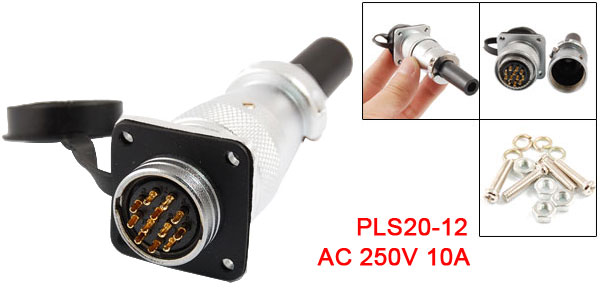 DetailsWaterproof Rubber Cover 12 Pin Electric Deck Connector AC 250V 10A  Product Name Circular Connector Model PLS20-12 External Material Metal, Rubber Pin Quantity 12 Working Voltage AC 250V Withstand Voltage AC 1500V Current 10A Insulation Resistance 500m Ohm Contact Diameter 1mm Head Diameter 20mm Hole Diameter 3mm/ 0.12" Overall Size 97 x 28 x 28mm/ 3.8" x 1.1" x 1.1" (H*L*W) Color Silver Tone, Black Net Weight 94g Package Content 1 x Circular Connector Install Part