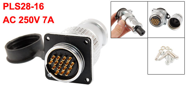 Product Name Circular Connector Model PLS28-16 Contacts Pin Number 16 Contacts Pin Diameter 1mm/0.039" Working Voltage AC 250V Working Current 7A Withstand Voltage AC 1500V Insulator Resistance 2000 MOhm Fit Cable Outside Dia. 5.5mm/0.217" Mounting Hole Dia. 3mm/0.118'' Mounting Size 30 x 30mm/ 1.2" x 1.2" (L*W) Overall Size 81 x 35 x 35 mm/3.2" x 1.4" x 1.4"(L*W*H) Material Metal, Plastic Color Silver Tone, Black Weight 167g Package 1 x Circular Connector