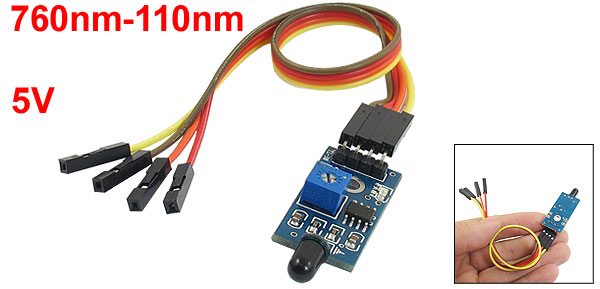 Product Name Flame Sensor Module Chip LM393 Wavelength 760nm-1100nm Output Channel 2(DO / AO) Working Voltage 5V Borad PCB Size 30 x 15mm/ 1.2" x 0.6" (L*W) Hole Size 3mm/ 0.12" Wire Lenght 21cm/8.3" Material Electric Part Net Weight 6g Package Content 1 x Flame Sensor Module w 4-Wire - Reviews
