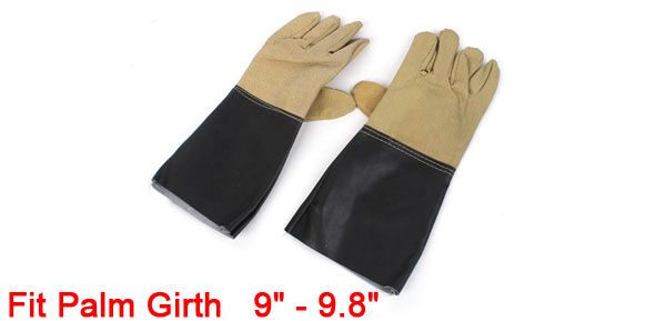 Product Name Welding Gloves Material Faux Suede, Denim Flat Size 34 x 16cm/ 13.3" x 6.3" (L*W) Wrist Open Girth 32cm/ 12.6" Fit Palm Girth 23-25cm/ 9" - 9.8" Color Brown, Black Weight 128g Package Content 1 Pair x Welding Gloves - Reviews