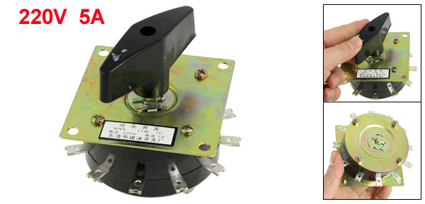 Product Name Combination Changeover Switch Model No. KHS 1X11 Frequency 50 Hz Rated Voltage 220V Rated Current 5A Terminal Screw Diameter 3.6mm / 0.14" Square Plate Size 77 x 77mm / 3.03" x 3.03" (L * W) Fixing Hole Distance(center to center) 65mm / 2.56" Pin Size 11 x 6 x 1.7mm / 0.43" x 0.24" x 0.067" (L * W * T) Total Height(not include screw) 130mm / 5.1" Net Weight 576g Material Plastic, Metal Main Color Black, Brass Tone Package Content 1 x Combination Changeover Switch - Reviews