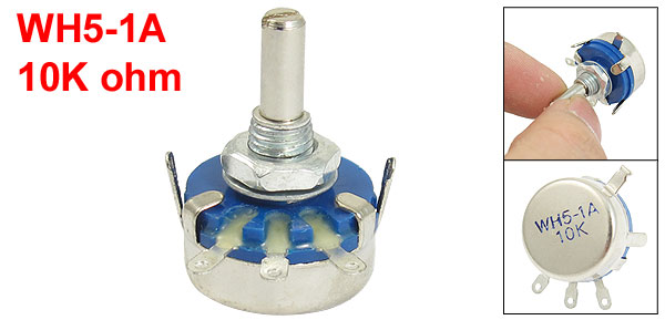 Product Name Potentiometer Model WH5-1A Technology Carbon Composition Adjustment Type Top Adjustment Type Single Linear Resistance Value 10K ohm Tolerance 5% Turn Number Single Turn Terminals Number 3 Features Round Shaft Body Size 18 x 9mm / 0.71" x 0.35"(D * H) Screw Thread Dia. 6mm / 0.24" Shaft Diameter 4mm / 0.16" Shaft Length 10mm / 0.4" Total Length 26mm / 1" Color Blue, Silver Tone Net Weight 7g Package Content 1 x Potentiometer - Reviews