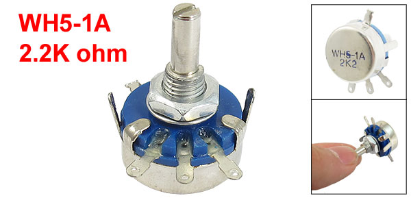 DetailsWH5-1A 2.2K ohm 4mm Round Shaft Linear Taper Rotary Carbon Potentiometer  Product Name Potentiometer Model WH5-1A Technology Carbon Composition Adjustment Type Top Adjustment Type Single Linear Resistance Value 2.2K ohm Tolerance 5% Turn Number Single Turn Terminals Number 3 Features Round Shaft Body Size 18 x 9mm / 0.71" x 0.35"(D * H) Screw Thread Dia. 6mm / 0.24" Shaft Diameter 4mm / 0.16" Shaft Length 10mm / 0.4" Total Length 26mm / 1" Color Blue, Silver Tone Net Weight 7g Package Content 1 x Potentiometer