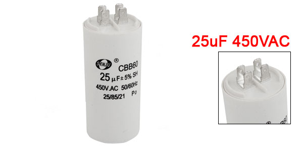 Product Name Motor Capacitor Material Polypropylene Film Model CBB60 Capacitance 25uF Tolerance ±5% Rated Voltage AC 450V Frequency 50/60Hz Body Size 44 x 107mm/ 1.7" x 4.2" (D * H) Color White Weight 149g Package Content 1 x Motor Capacitor - Reviews