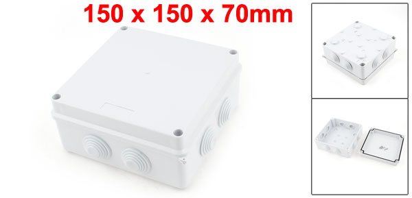 Product Name Waterproof Junction Box Total Size 150 x 150 x 70mm/ 5.9" x 5.9" x 2.8"(L*W*H) Internal Size 145 x 145 x 66mm/ 5.7" x 5.7" x 2.6"(L*W*H) Hole Diameter(Each) 26mm/ 1" IP Grade IP65 Material ABS Color White Net Weight 253g Package 1 x Waterproof Junction Box
