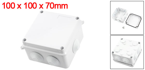 Product Name Square Junction Box Total Size 100 x 100 x 70mm/ 3.9" x 3.9" x 2.8"(L*W*H) Internal Size 100 x 100 x 60mm/ 3.9" x 3.9" x 2.4"(L*W*H) Cable Entries Number 7 Mounted Type Surface Mounted Hole Diameter 26mm/ 1" Waterproof Rating IP65 Material ABS, Rubber Color White Net Weight 152g Package 1 x Square Junction Box - Reviews