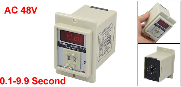 Product Name Digital Time Relay Type ASY-2D Rated Voltage AC 48V Frequency 50/60 Hz Contact AC 220V 5A Non-inductive Load Time Range 0.1-9.9 Second Mount Size (Approx.) 49 x 68 x 61mm/ 1.9" x 2.7" x 2.4" (L*W*H) Mount Hole Diameter 4mm/ 0.16" Total Size 57 x 90 x 86mm/2.2" x 3.5" x 3.4"(L*W*H) Color White Net Weight 199g Package Content 1 x Digital Time Relay - Reviews