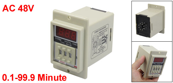 Product Name Digital Time Relay Type ASY-3D Rated Voltage AC 48V Frequency 50/60 Hz Contact AC 220V 5A Non-inductive Load Time Range 0.1-99.9 Minute Mount Size (Approx.) 49 x 68 x 61mm/ 1.9" x 2.7" x 2.4" (L*W*H) Mount Hole Diameter 4mm/ 0.16" Total Size 57 x 90 x 86mm/2.2" x 3.5" x 3.4"(L*W*H) Color White Net Weight 204g Package Content 1 x Digital Time Relay - Reviews