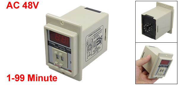 Product Name Digital Time Relay Type ASY-2D Rated Voltage AC 48V Frequency 50/60 Hz Contact AC 220V 5A Non-inductive Load Time Range 1-99 Minute Mount Size (Approx.) 49 x 68 x 61mm/ 1.9" x 2.7" x 2.4" (L*W*H) Mount Hole Diameter 4mm/ 0.16" Total Size 57 x 90 x 86mm/2.2" x 3.5" x 3.4"(L*W*H) Color White Net Weight 199g Package Content 1 x Digital Time Relay - Reviews