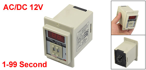 Product Name Digital Time Relay Type ASY-2D Rated Voltage AC/DC 12V Frequency 50/60 Hz Contact AC 220V 5A Non-inductive Load Time Range 1-99 Second Mount Size (Approx.) 49 x 68 x 61mm/ 1.9" x 2.7" x 2.4" (L*W*H) Mount Hole Diameter 4mm/ 0.16" Total Size 57 x 90 x 86mm/2.2" x 3.5" x 3.4"(L*W*H) Color White Net Weight 129g Package Content 1 x Digital Time Relay - Reviews