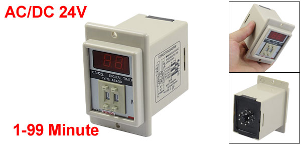 Product Name Digital Time Relay Type ASY-2D Rated Voltage AC/DC 24V Frequency 50/60 Hz Contact AC 220V 5A Non-inductive Load Time Range 1-99 Minute Mount Size (Approx.) 49 x 68 x 61mm/ 1.9" x 2.7" x 2.4" (L*W*H) Mount Hole Diameter 4mm/ 0.16" Total Size 57 x 90 x 86mm/2.2" x 3.5" x 3.4"(L*W*H) Color White Net Weight 129g Package Content 1 x Digital Time Relay - Reviews